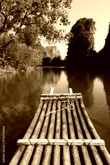 Bamboo rafting in idyllic Li River scenery, landscape of Yangshuo in Guilin, China