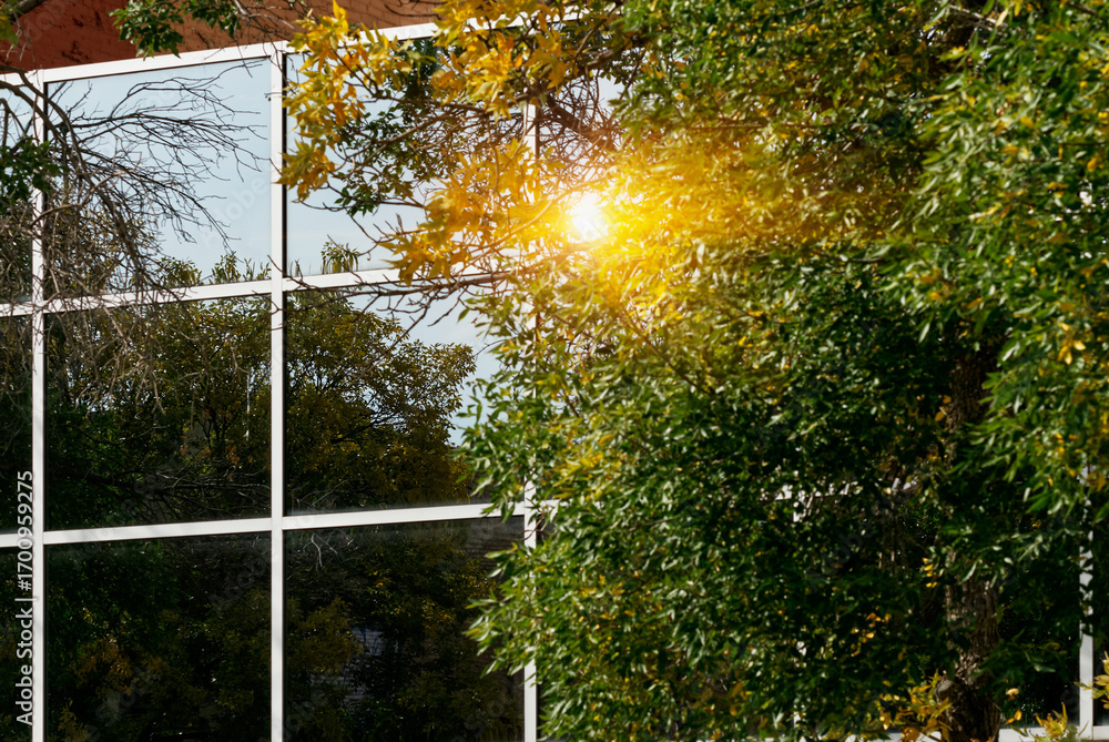 Detailed view of a modern high-rise building in downtown Saskatoon, Canada, showing vertical white lines and glass panels reflecting the sky and clouds.