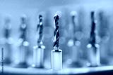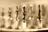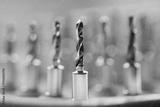Full set of dental implant drill bits in surgical tray, close-up of professional dentistry equipment