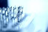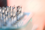 Full set of dental implant drill bits in surgical tray, close-up of professional dentistry equipment