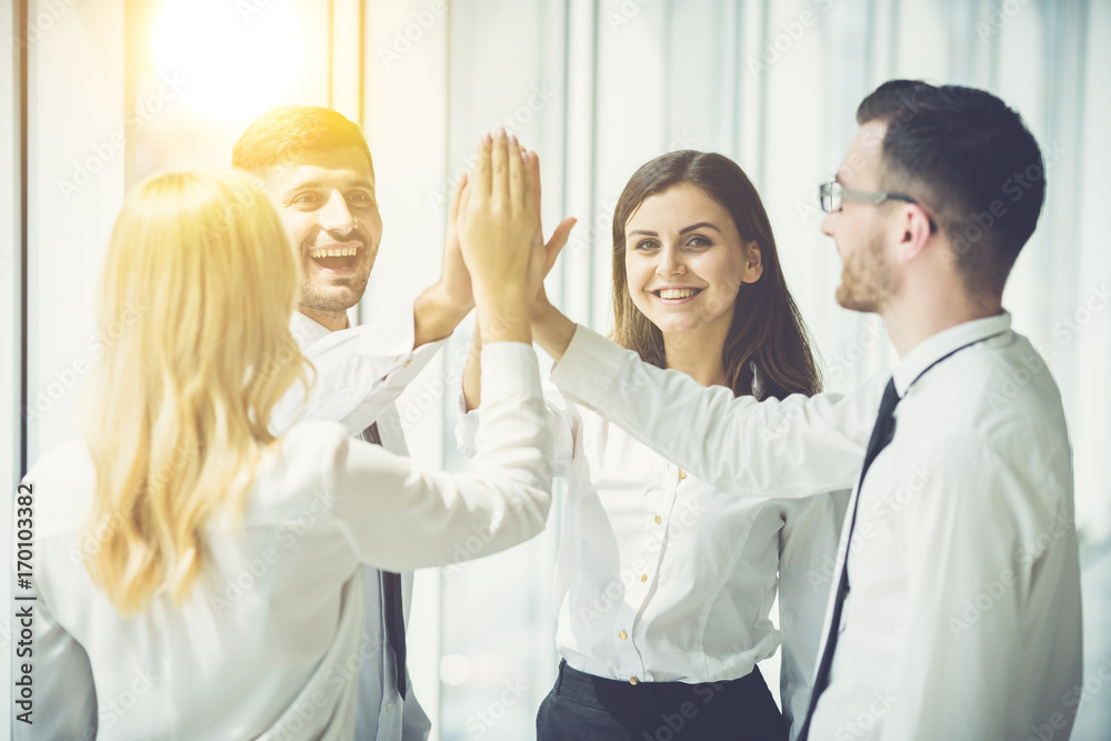 The four business people greeting with a high five on the sun background