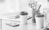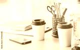 The office desktop with a phone and a cup of coffee