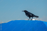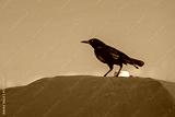 Boat-Tailed Grackle perched on a blue beach umbrella.