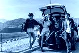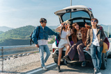 Happy Young Asian man and woman friends road trip travel countryside on summer holiday vacation. Generation z people enjoy outdoor active lifestyle sitting on EV car trunk and looking beautiful nature