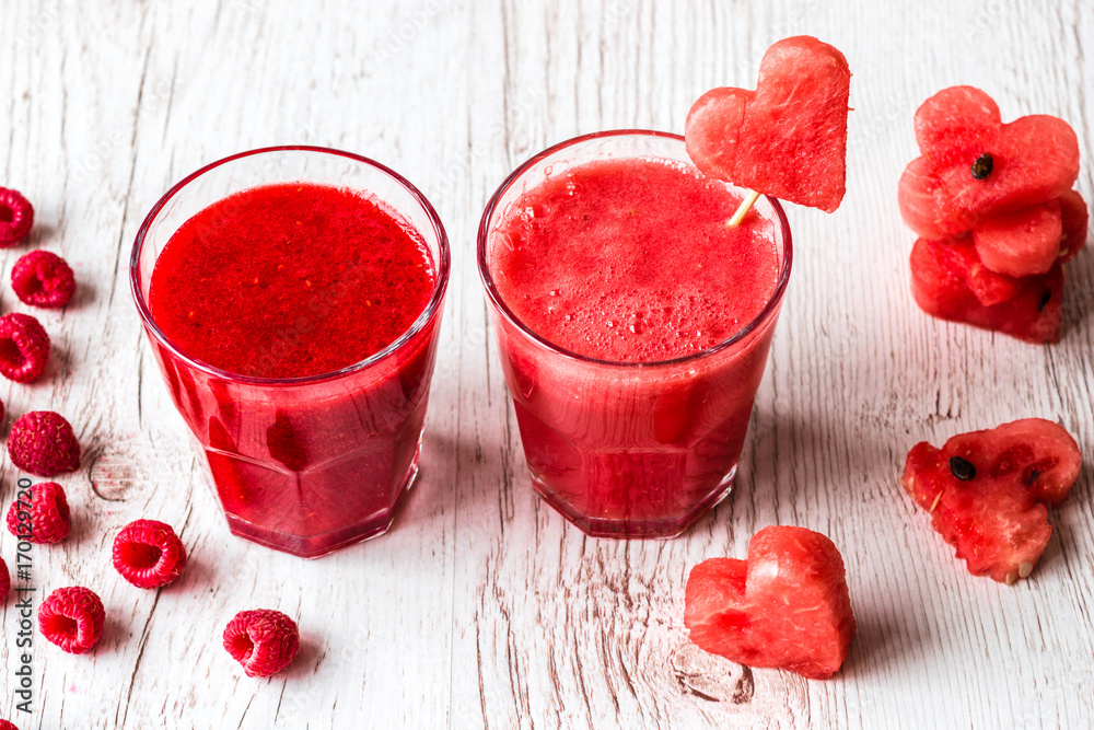 healthy drinks. watermelon and raspberry smoothie on white wooden background
