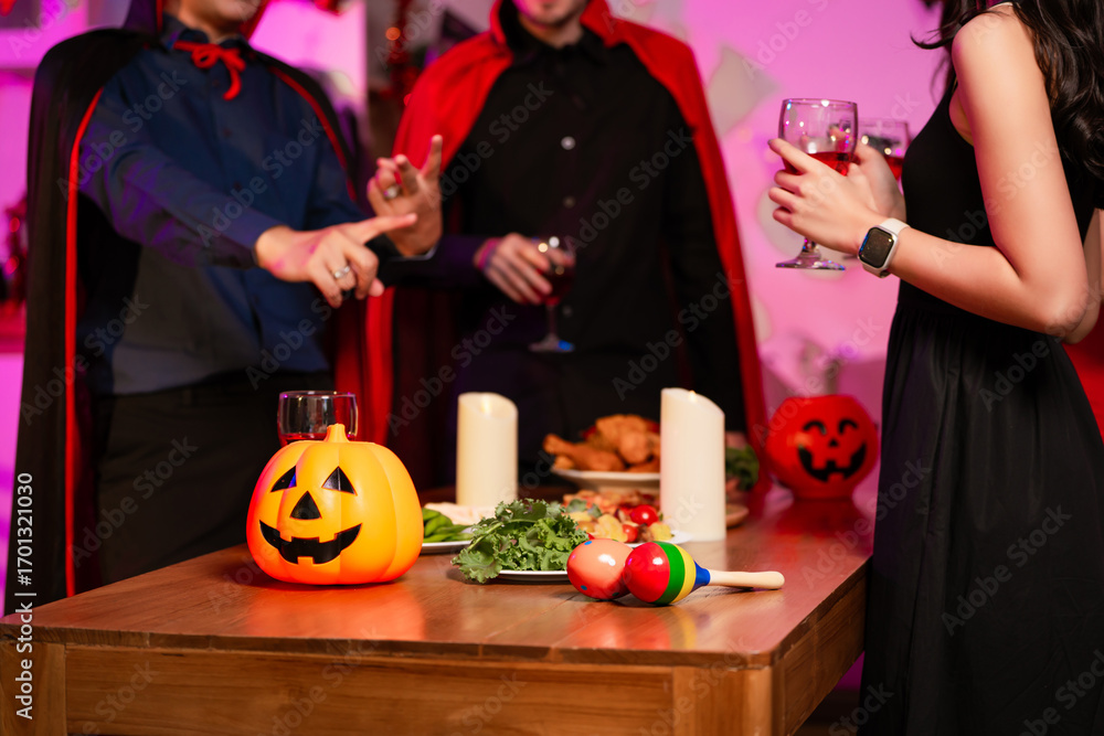 Friends celebrate a lively Halloween party with costumes, pumpkin lanterns, wine, delicious food on the table. The night is filled with laughter, colorful lights, and festive energy for seasonal joy.