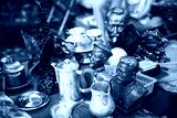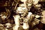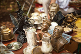 USSR famous historic persons busts and metal tableware at a flea market. Many old vintage things at a garage sale
