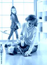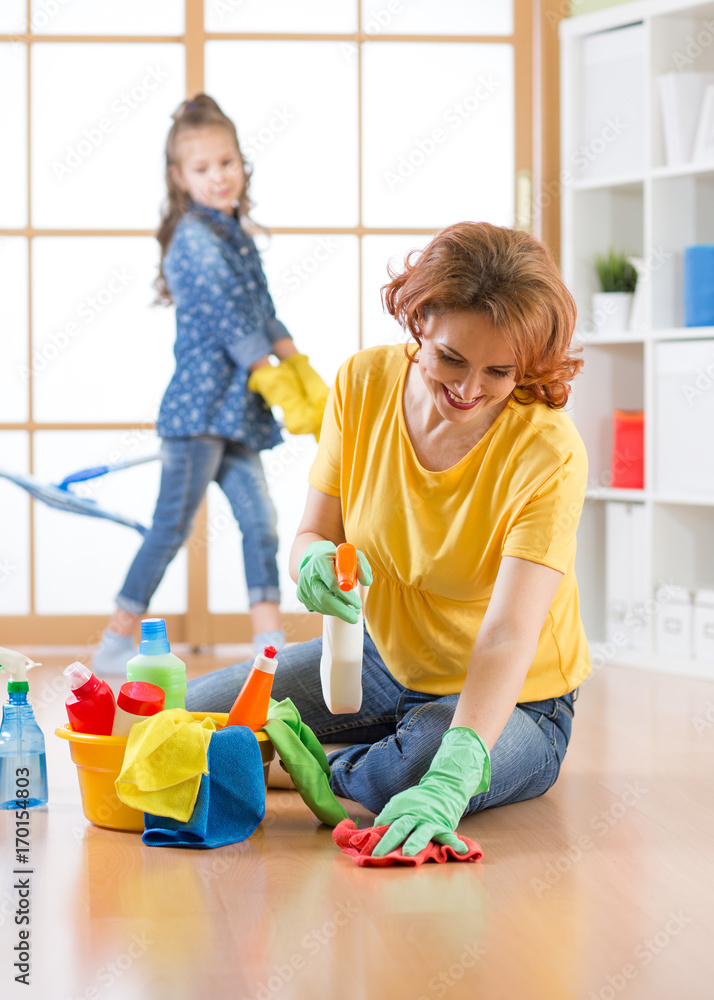 Happy family cleans the room. Mother and her child daughter do the cleaning in the house.