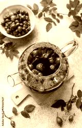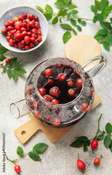 Steaming rosehip tea brewing in glass teapot with fresh rose hips