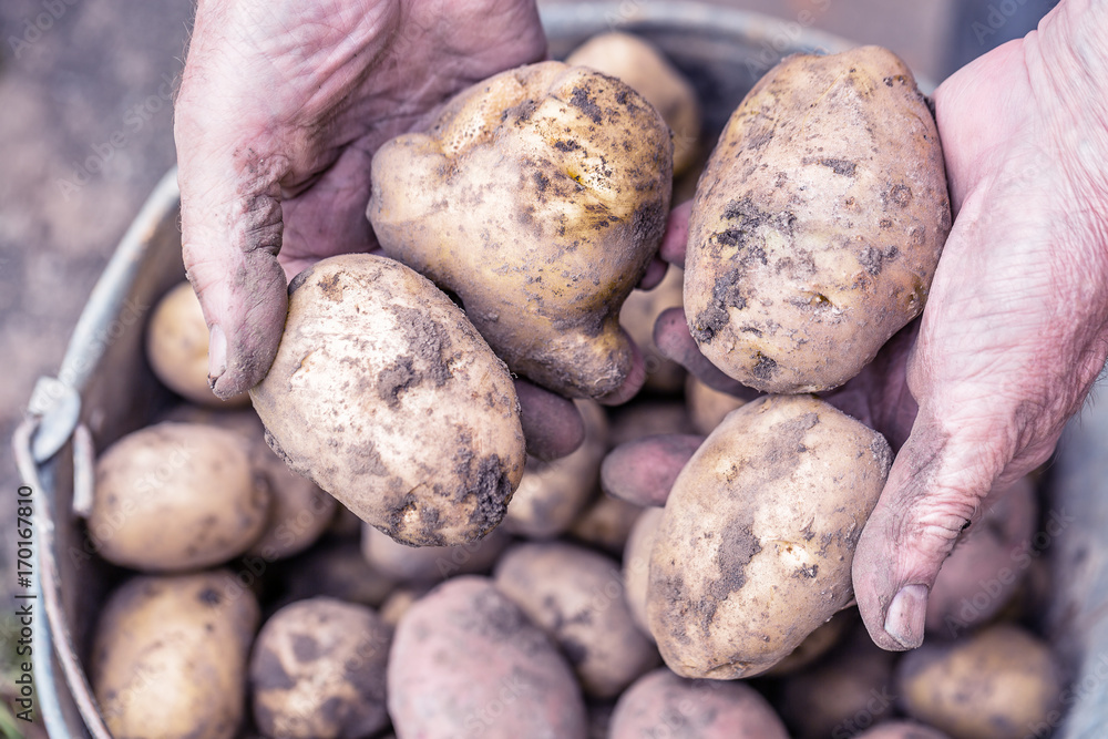Fresh potatoes in old elderly farmer's hands above the bucket. Toned image.