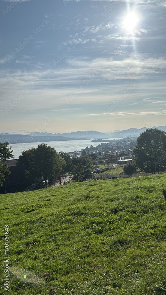 Sunny panoramic view over bright green meadows in Horgen Oberdorf, with Lake Zurich (Zürichsee) glistening in the background and distant blue alpine mountains under a clear sky.