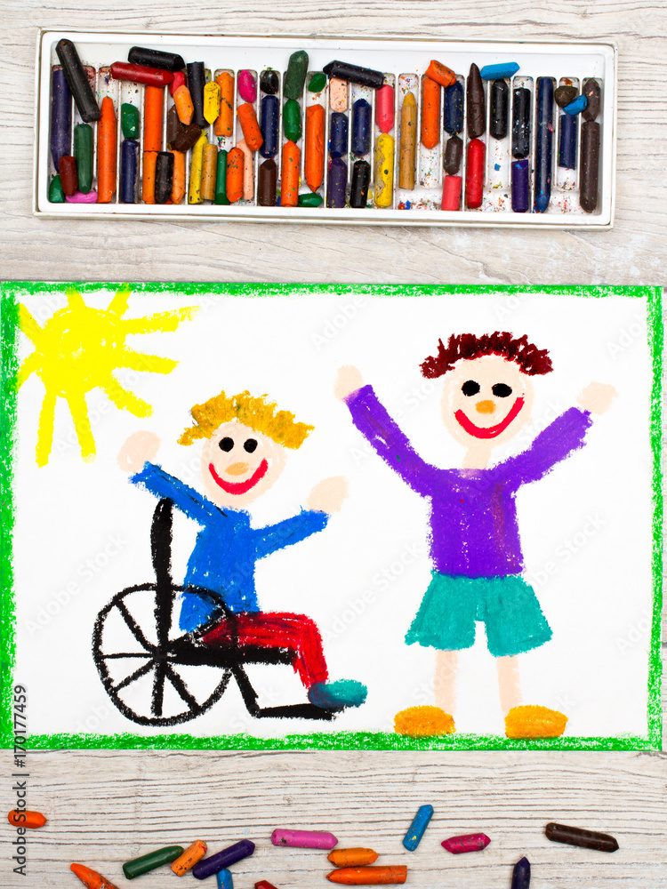 Photo of colorful drawing: Smiling boy sitting on his wheelchair. Disabled boy with a friend