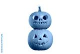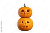 Two stacked carved Halloween pumpkins jack o’lanterns isolated on white background, spooky holiday decoration with copy space