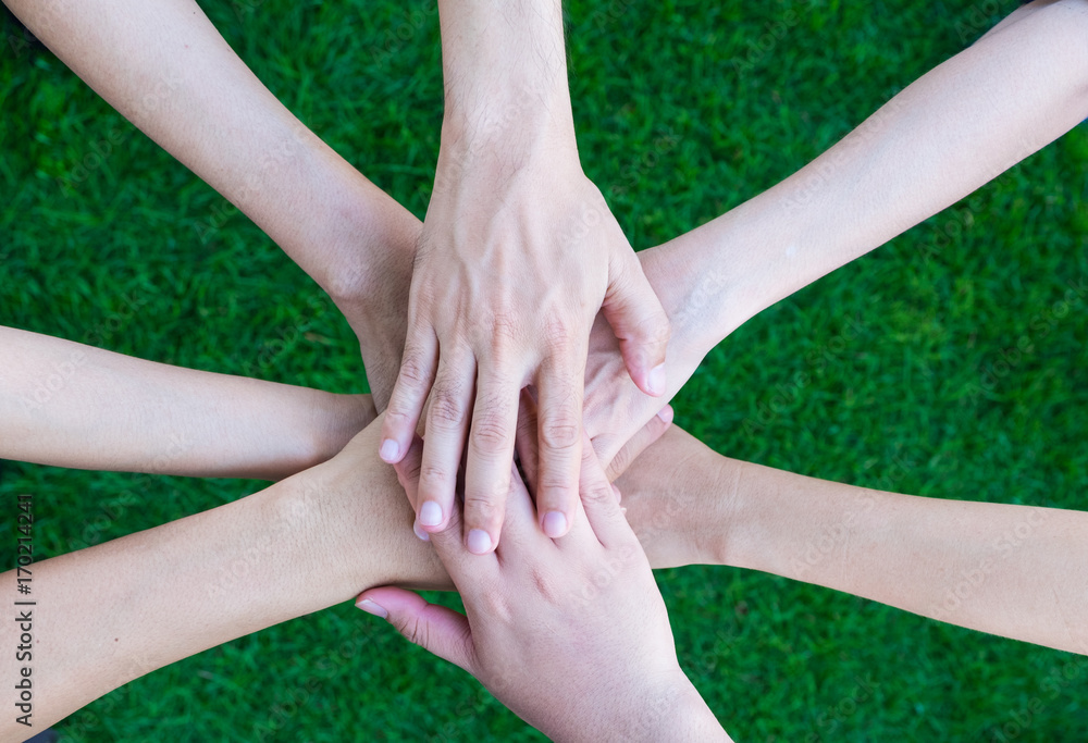 Close up asian business people hands together over green grass out of office,Teamwork concept