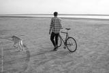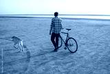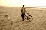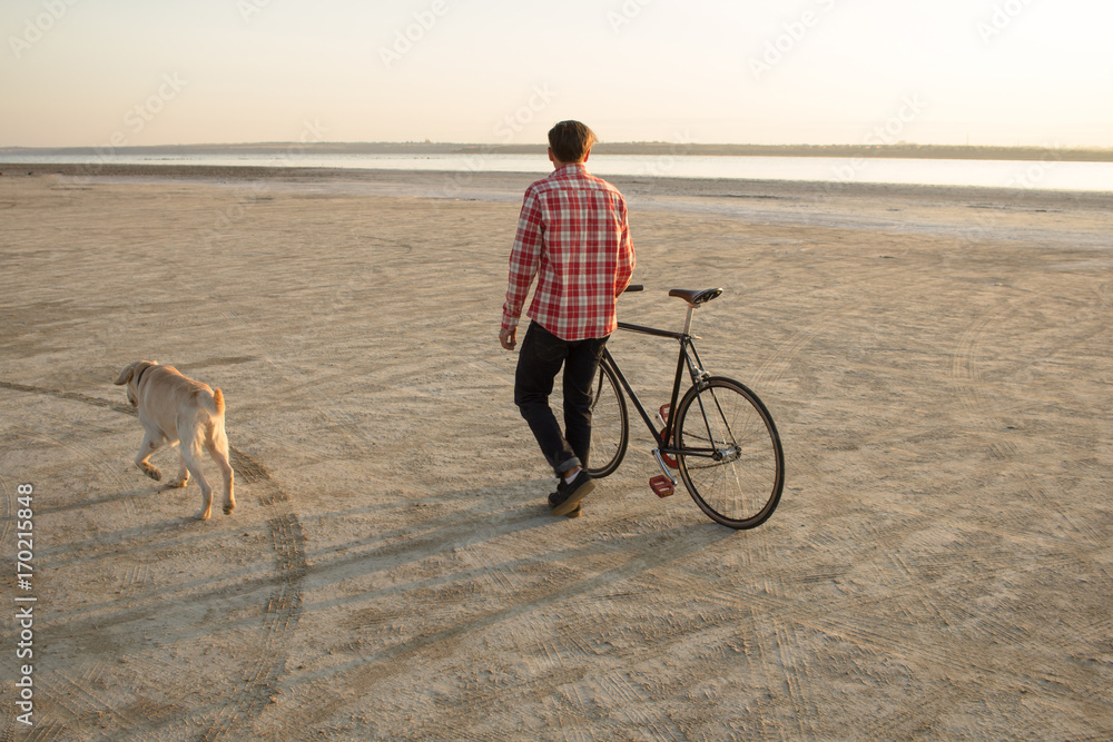 male bicycle rider walking on the sand, sunrise and lake or river background
