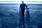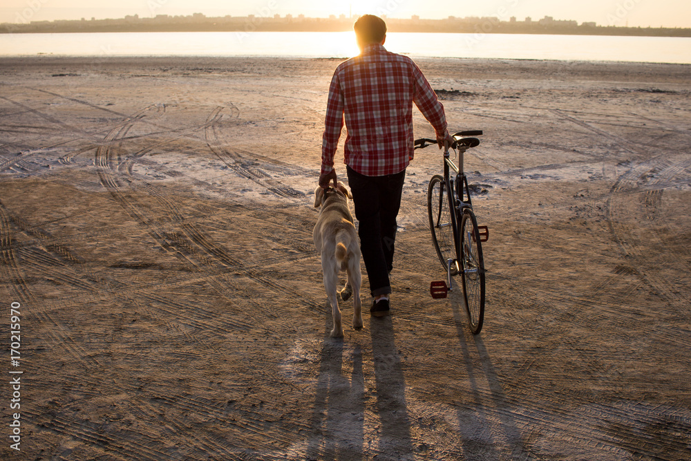 male bicycle rider walking on the sand, sunrise and lake or river background