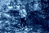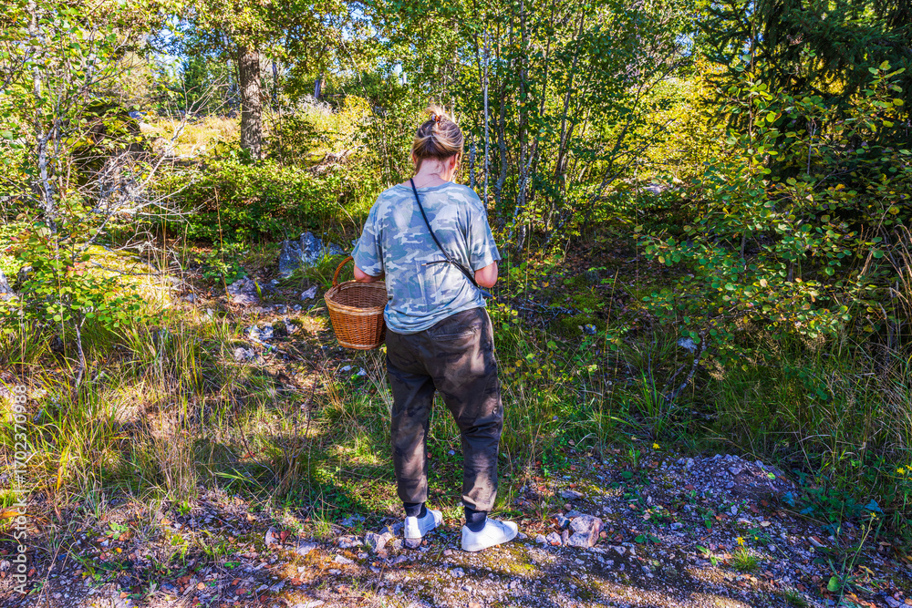 Close up view of woman standing in autumn forest with wicker basket for mushroom picking. Sweden.