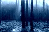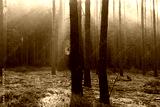Mglisty poranek w sosnowym lesie. Pomiędzy wysokimi drzewami unosi się opar mgły oświetlany promieniami słońca tworzącymi malownicze smugi światła. Na jednym z drzew wisi pajęczyna.