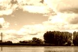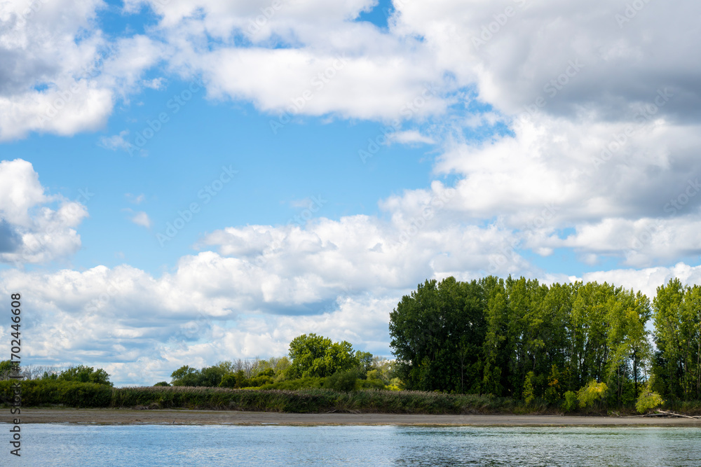 Landscape along the St. Lawrence River with a strip of land covered in trees on the horizon. The sky is dominated by large, fluffy white cumulus clouds against a blue sky background