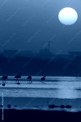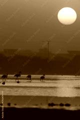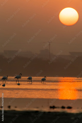 A group of Flamingos feeding on a marshy land on the outskirts of Jamnagar, Gujarat with colours of raising sun in the background silhouetting the bird