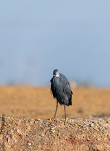 A western reef egret relaxing on a mound near a water body on the outskirts of Jamnagar, Gujarat