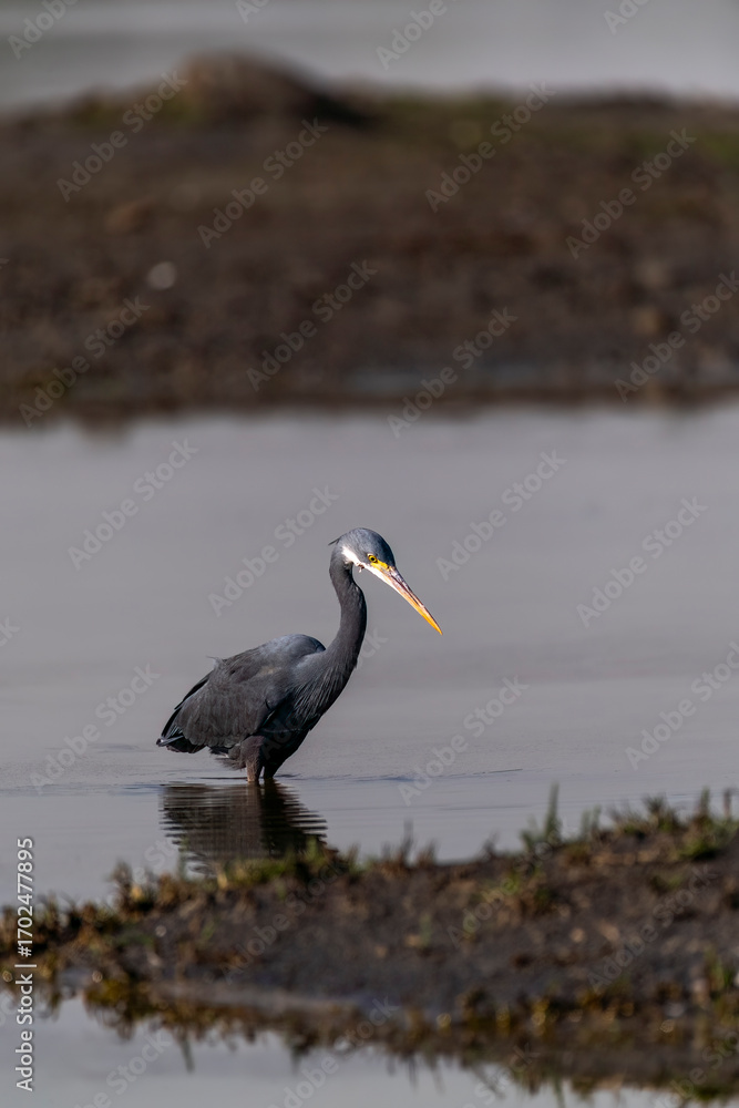 A western reef egret relaxing on a mound near a water body on the outskirts of Jamnagar, Gujarat