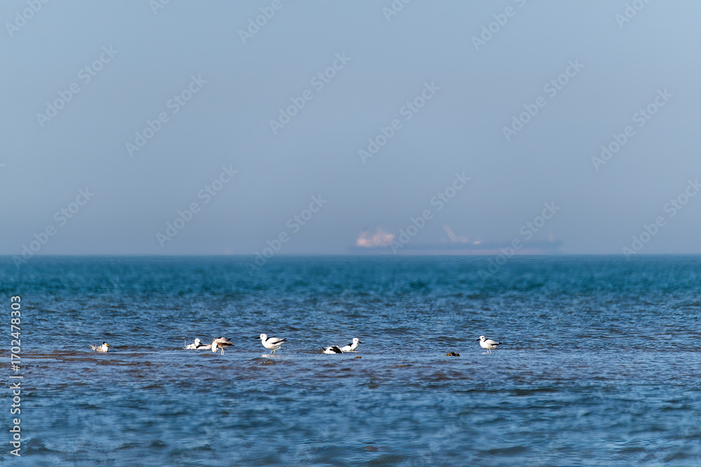 A group of Crab plovers feeding on the edge of the surf in Bay of bengal inside Marine National Park, Gujarat
