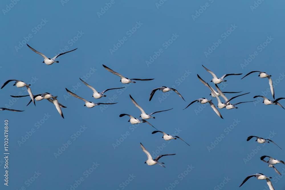 A group of Crab plovers flying on the shore in Bay of bengal inside Marine National Park, Gujarat