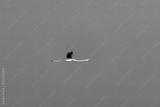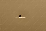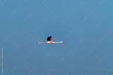 A flock of flamingos flying away with a beautiful blue sky on the outskirts of Jamnagar, Gujarat, India