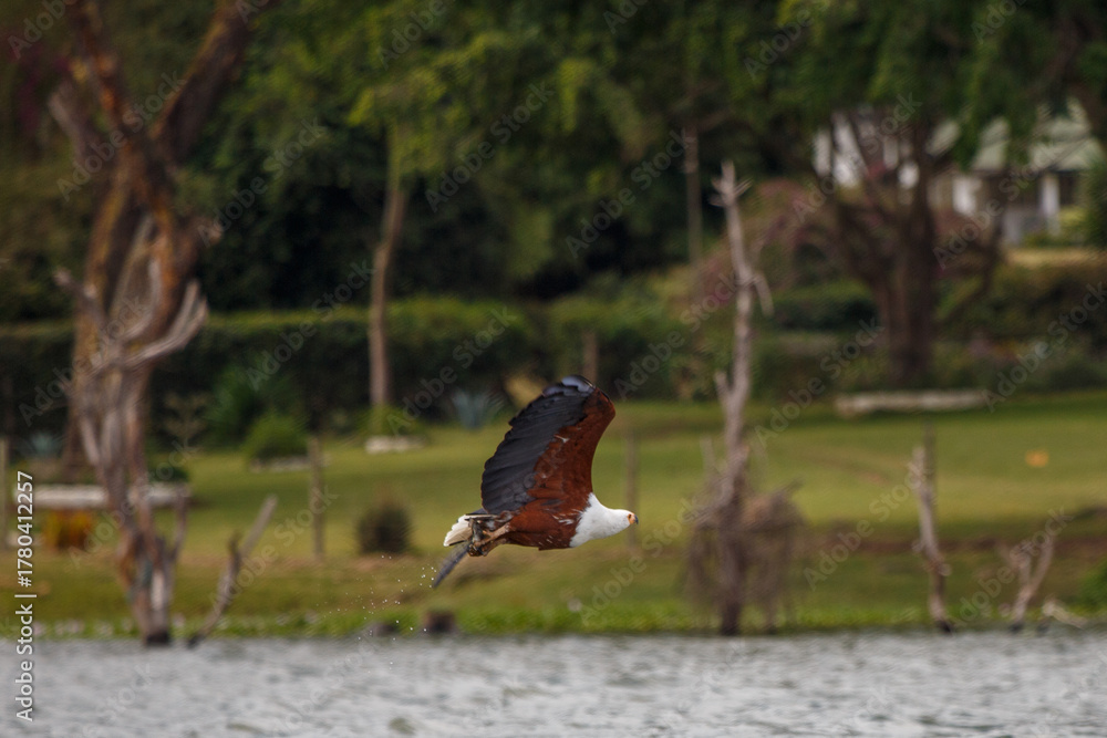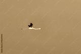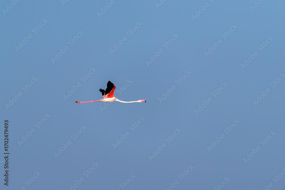 A flock of flamingos flying away with a beautiful blue sky on the outskirts of Jamnagar, Gujarat, India