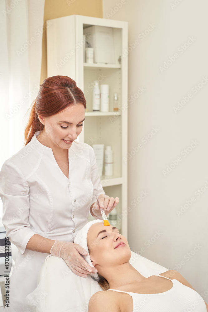 Female caucasian adult receiving skincare treatment in spa with smiling therapist applying facial serum.