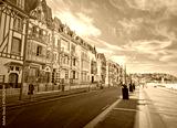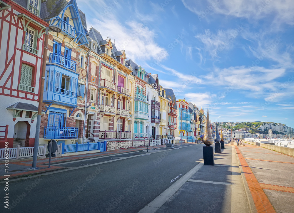 Charming Belle Epoque villas of Mers-les-Bains coastline town, arranged along the seaside promenade. Distinctive half-timbered architecture of different bright colors in Picardy, France