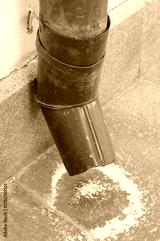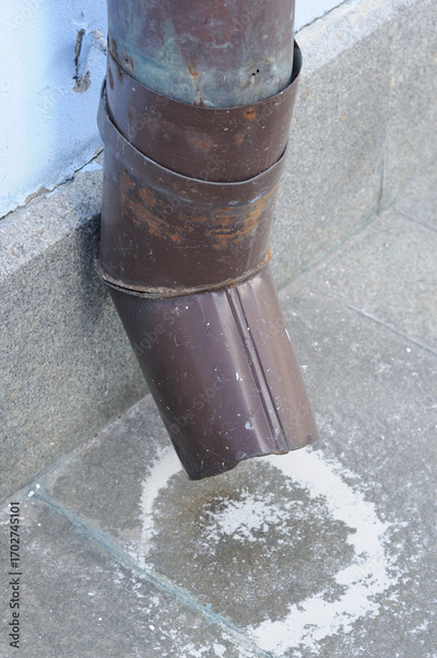 Metal pipe for draining water from the roof to the street. Close-up photo. Pipe with elbow.