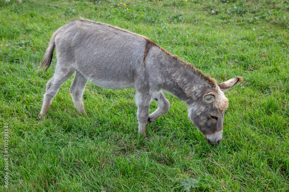 Gray Donkey Grazing on Green Grass in Pasture Field