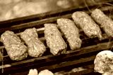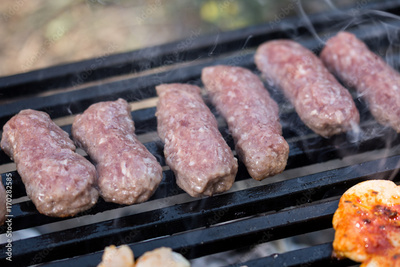 Selective focus on minced meat kebabs on the barbecue grill
