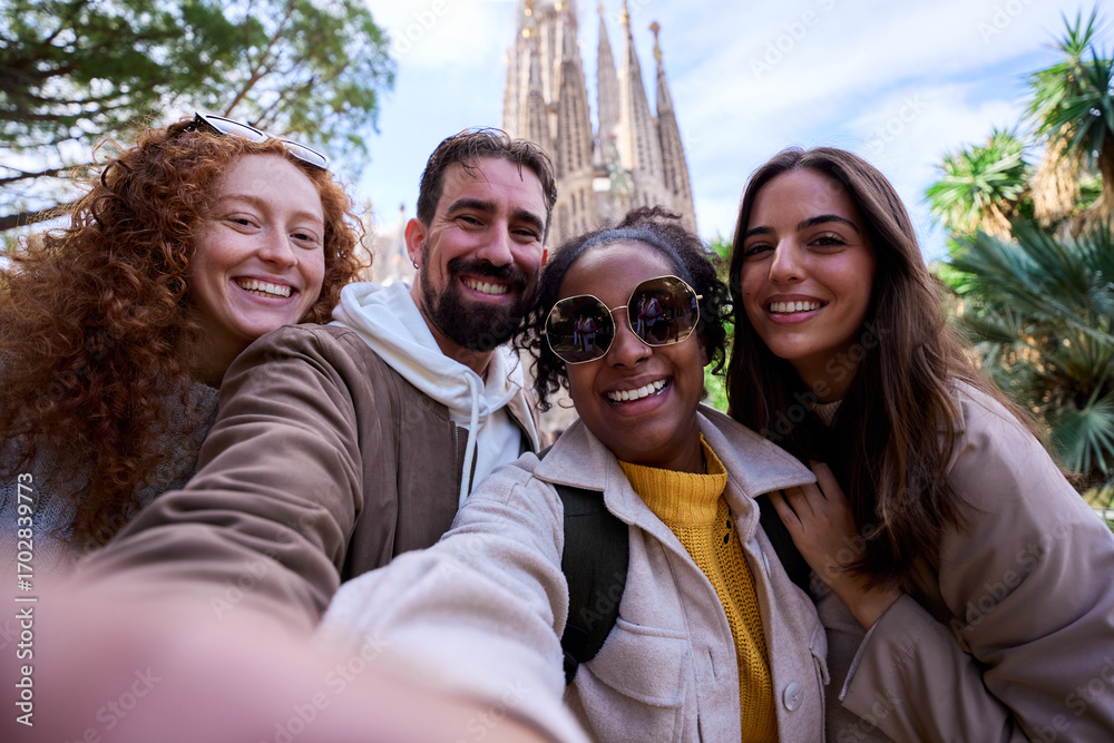 Multiracial group of tourists taking a happy selfie with sagrada familia in the background during weekend trip. Image with copy space.