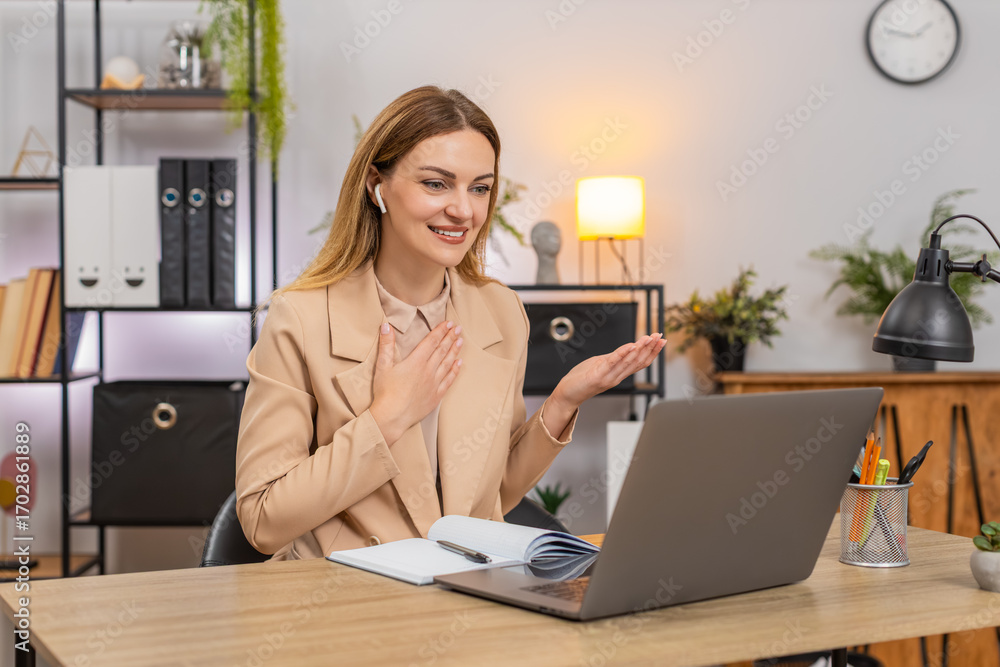 Middle-aged businesswoman at home office on laptop joins video lecture in earphones nods answers chat explains points. Freelancer girl at table runs interview in video chat thanks audience posts notes