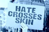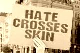 "Hate Crosses Skin". Another story of color used as a weapon. HATE. COLOR. WEAPON. CRIME. BLOOD. DIVIDE.