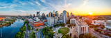 Panoramic view of Nashville skyline at sunset with river, skyscrapers, and city landmarks