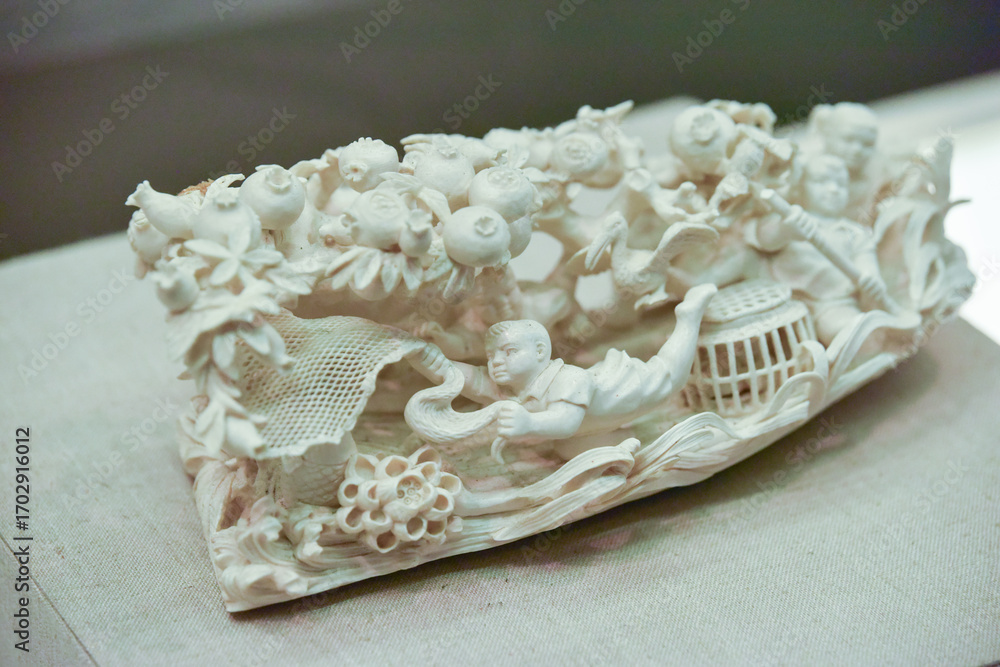 Intricate Carved Sculpture Depicting Children Playing Amidst Floral and Architectural Elements