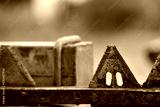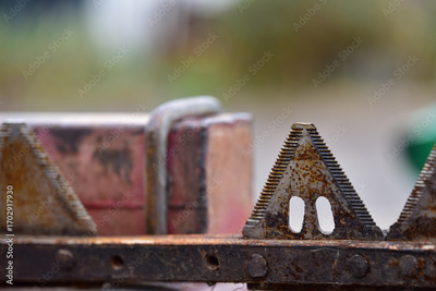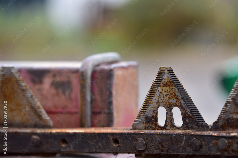 Close-up of a Rusty Metal Fence with Triangular Spikes