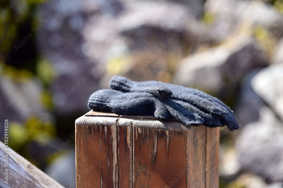 Gray gloves resting on a wooden post against a blurred natural background