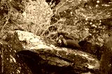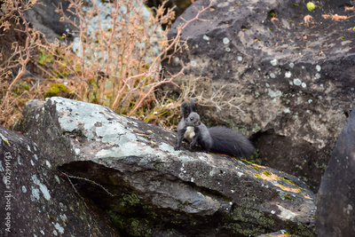 A squirrel perches on a moss-covered rock amidst natural surroundings.
