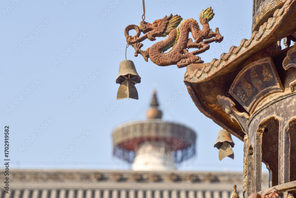 Traditional Dragon Bell Hanging from Temple Roof with Stupa in Background