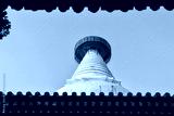 Traditional Pagoda Top Framed by Eaves Against a Clear Sky