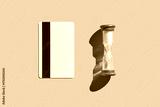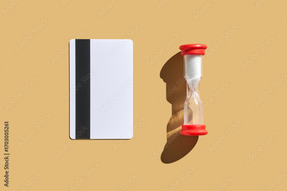 Minimalist composition of red hourglass and white notebook on beige background illustrating time and organization.