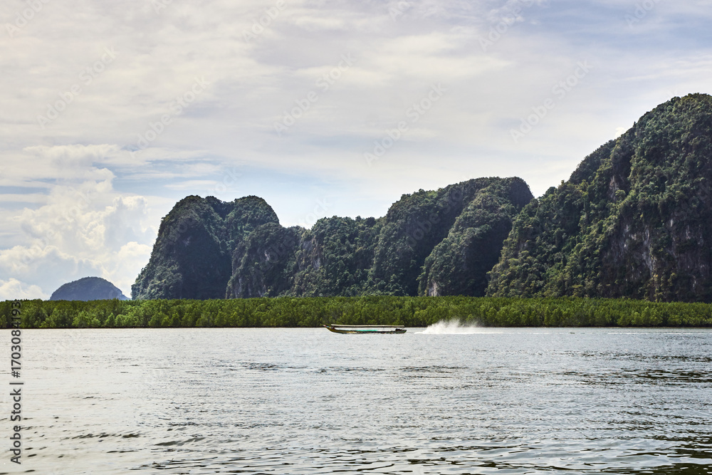 Longtail boat cruising near limestone cliffs in serene tropical landscape under partly cloudy sky.