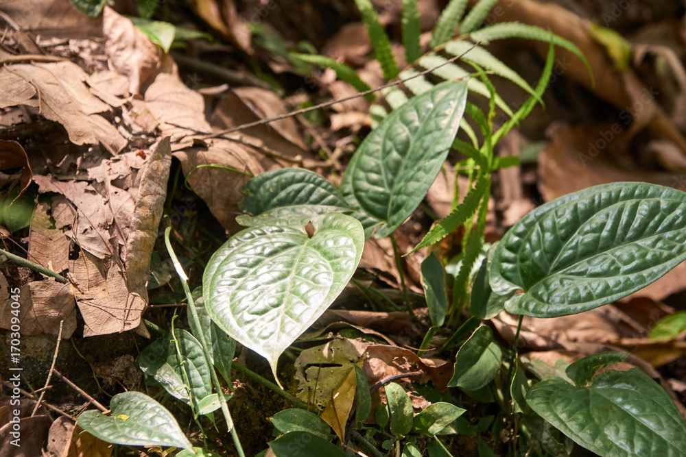 Green foliage with ferns and dry leaves in sunlit forest floor.