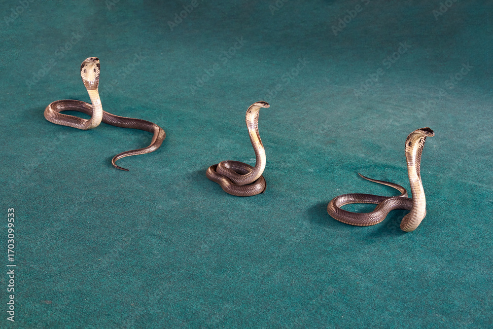 Three indian cobras on teal surface with raised hoods and s-shaped bodies in defensive posture.
