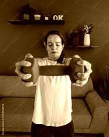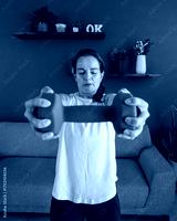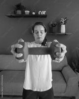 Woman exercising in her living room wearing workout clothes on a sunny day with gloves and an elastic band.